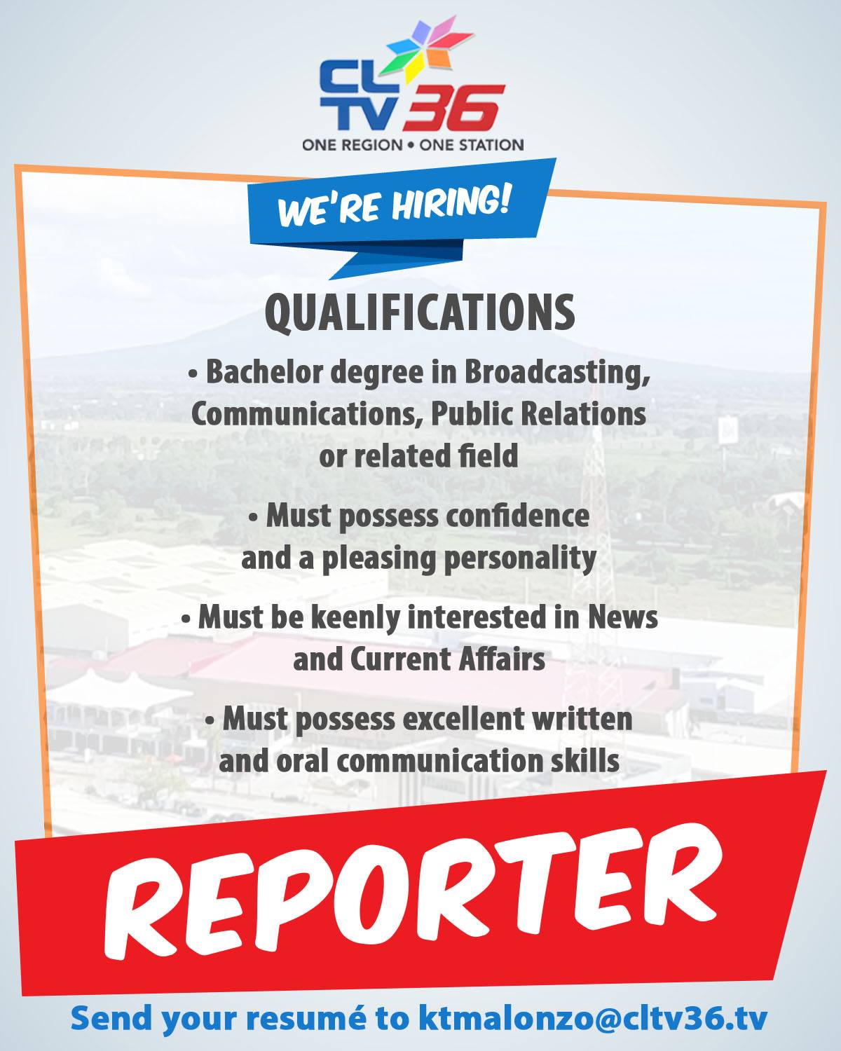 CLTV36, from its inception, was designed to serve the region through its locally-oriented news and public affairs programs. Aside from being the three-time KBP Golden Dove Awardee for Best TV Station (Provincial), CLTV36 is also the region’s most watched and most trusted source of news, infotainment, and entertainment, airing on free- to-air television and broadcasting over Pampanga, Bataan, Bulacan, Nueva Ecija and Tarlac, up to Pangasinan in the north and Rizal and Cavite in the south, including Metro Manila.